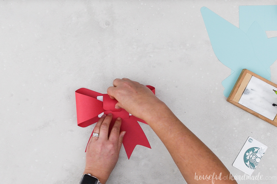 Now you can flip the bow over and place the gift card in the center. If you want, you can use a piece of double-sided tape or tiny dot of glue to secure it.