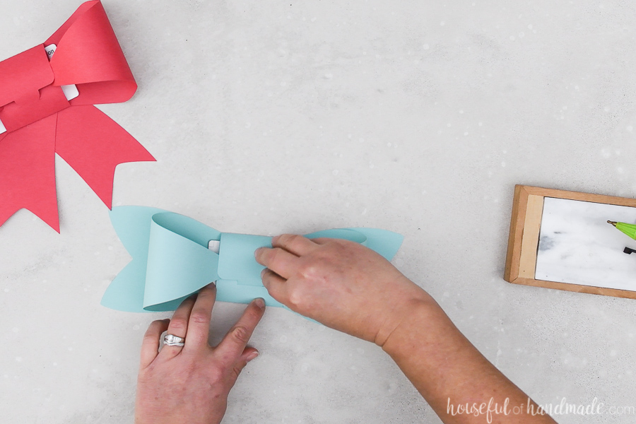 I used my Silhouette Cameo to cut out the bows on the cardstock setting. But feel free to cut them out with scissors. Then use an x-acto knife to cut the slits.
