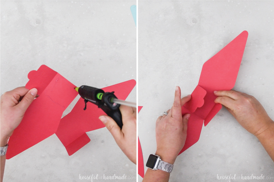 Add glue to the center square of one of the pieces and secure it on top of the other. Make sure the flaps still fold over properly.