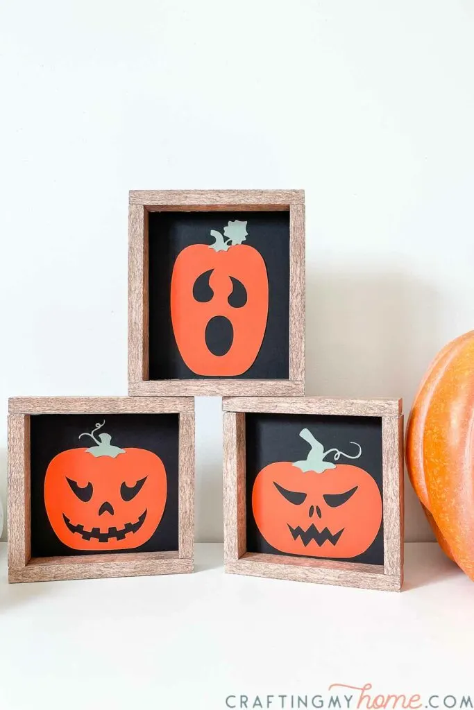 These simple Halloween signs look like little wood framed signs with spooky jack-o-lanterns on them. The bright colored pumpkins really pop on the black sign backgrounds.